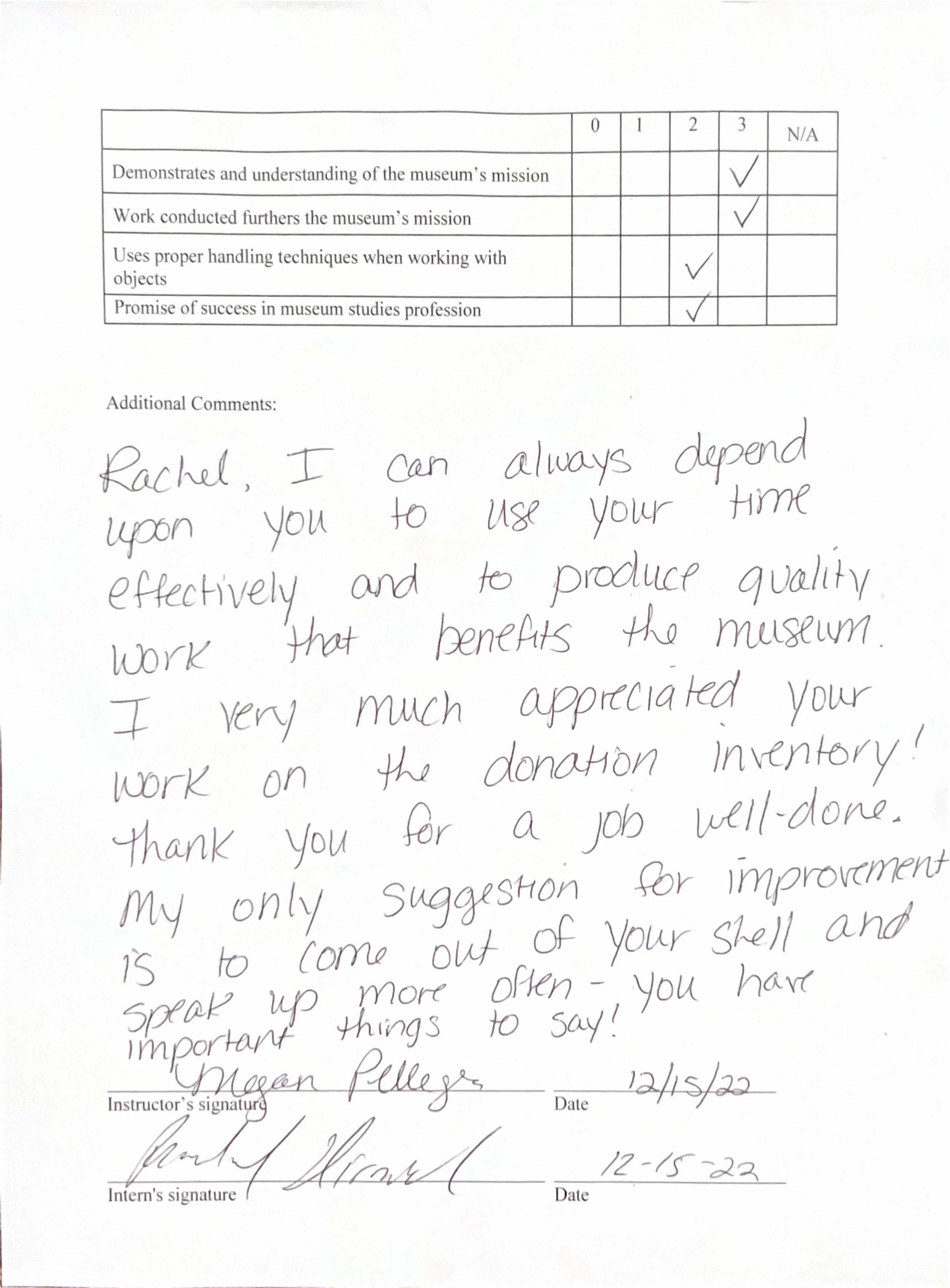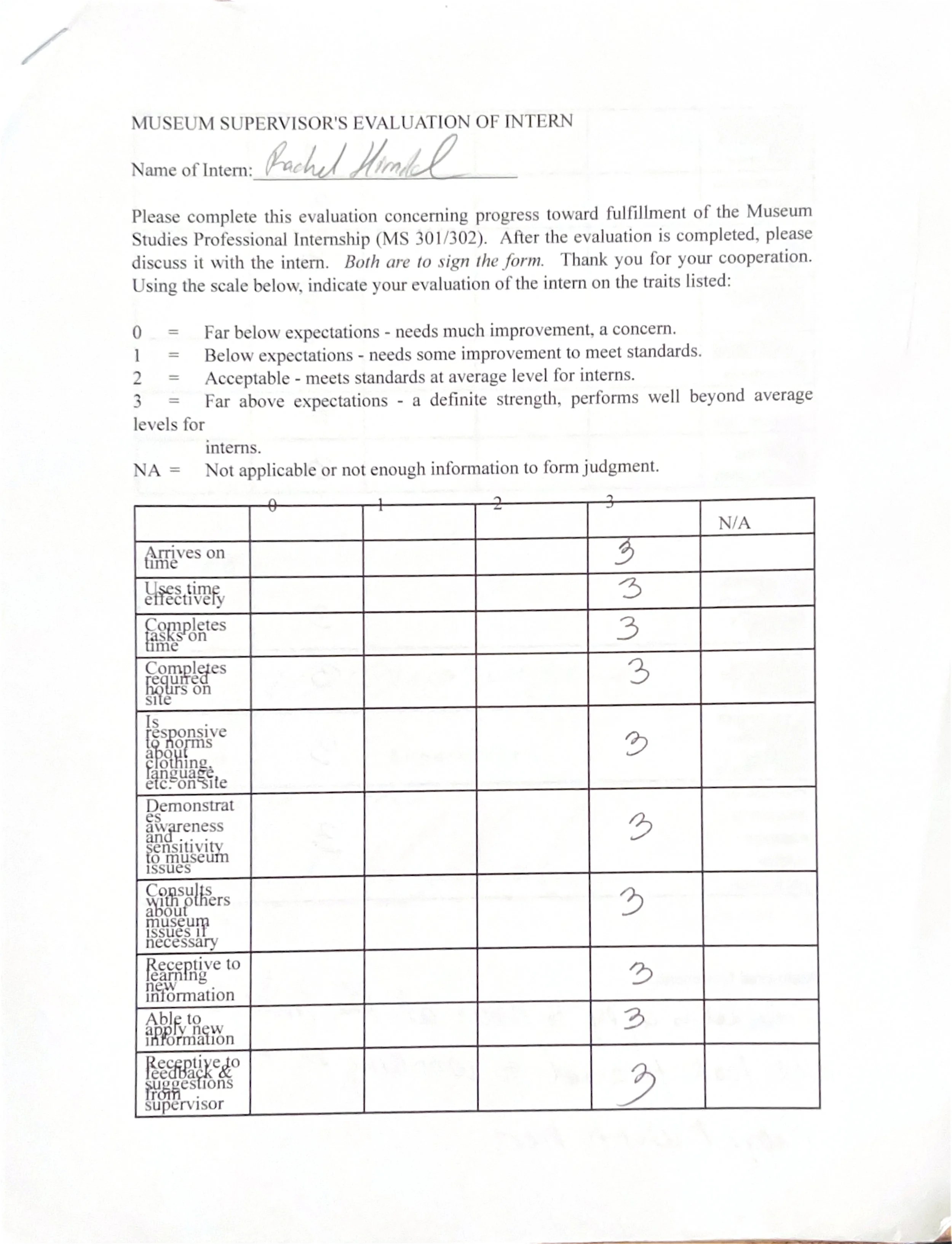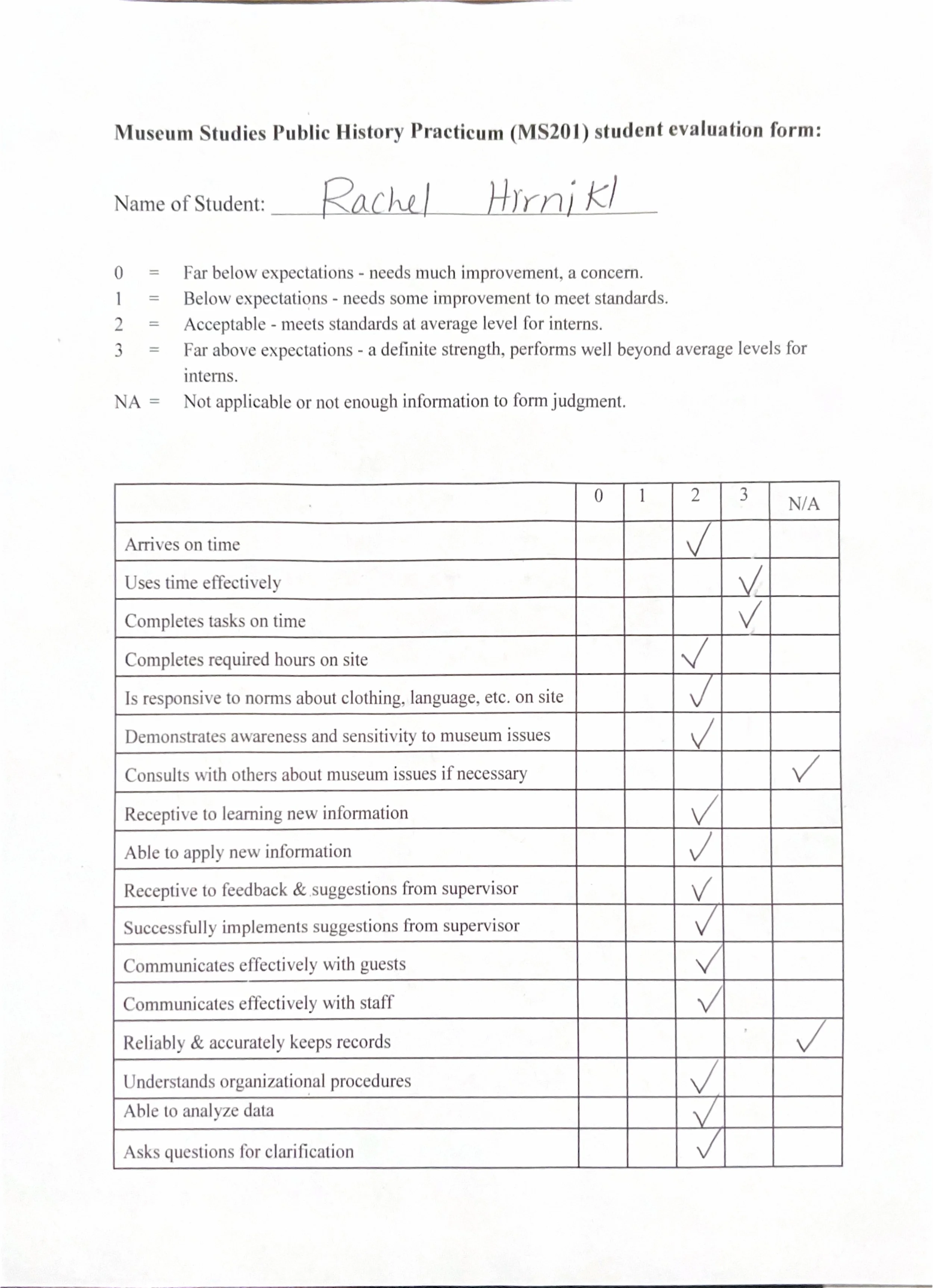 After each internship semester, the internship supervisor, in this case MAPS’ museum director, would complete a final evaluation on my performance. Here are the evaluations from MS 201 Public History Practicum, MS 301 & 302 Museum Studies Internhship I & II, and MS 415 Senior Internship.