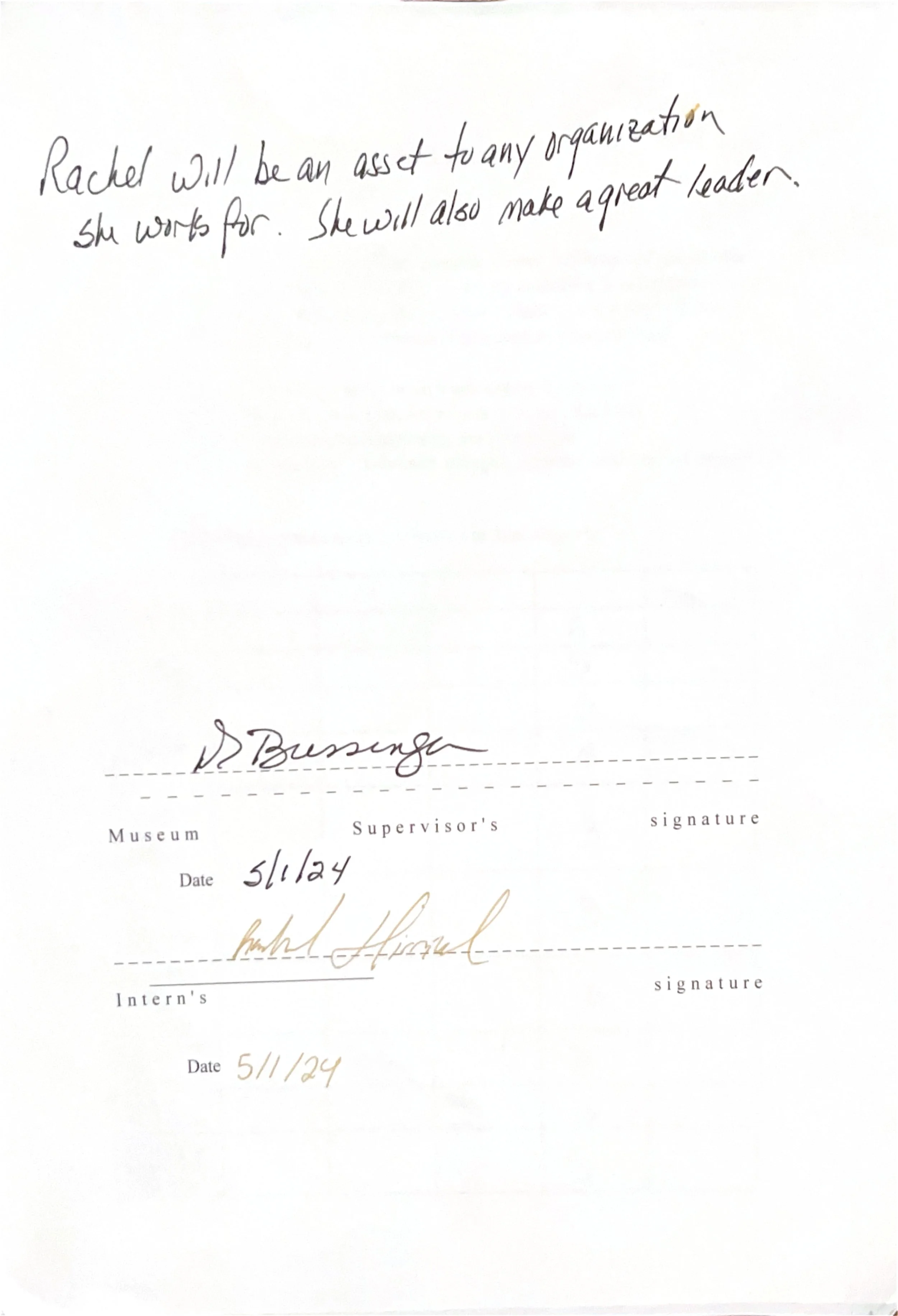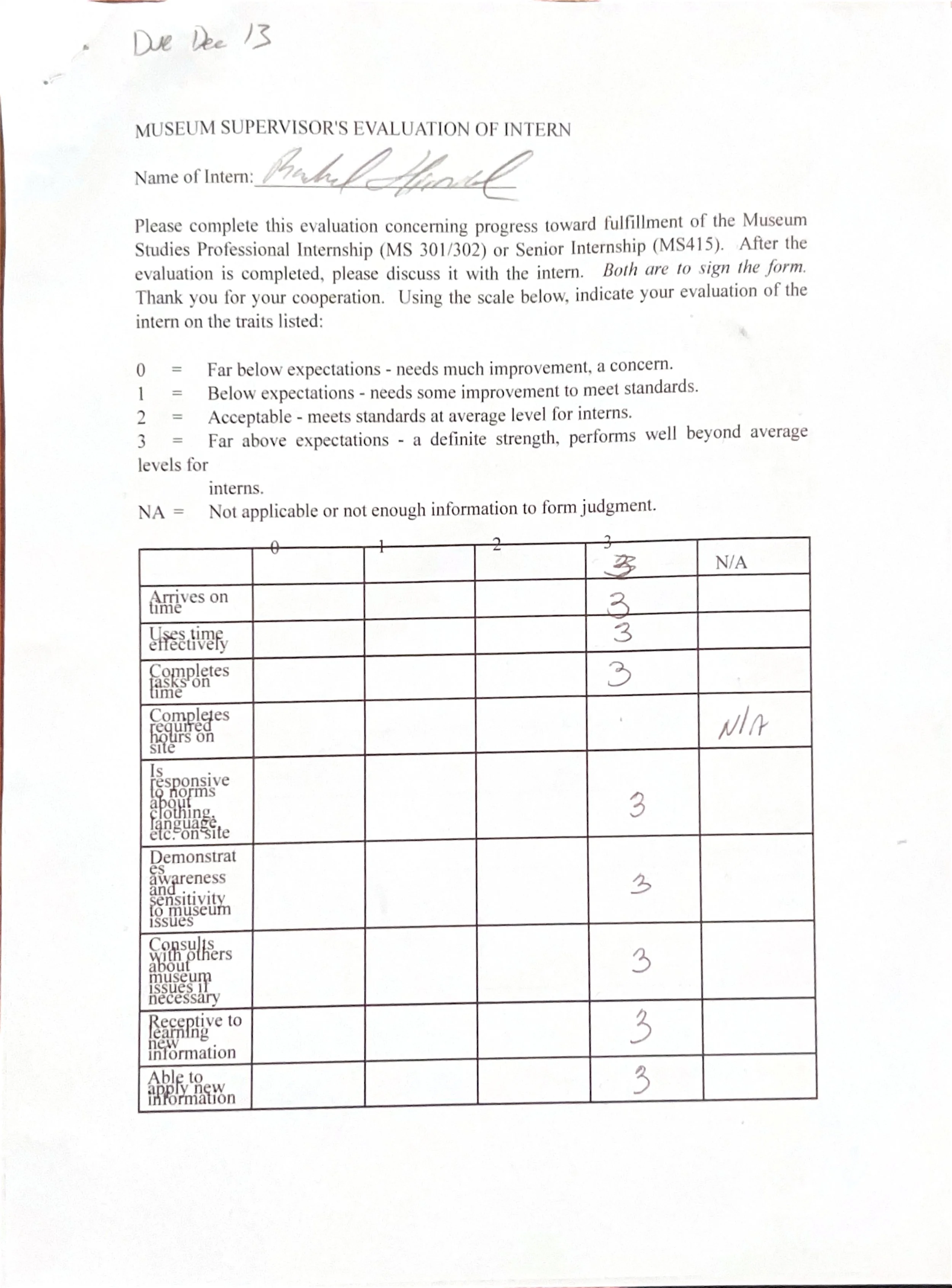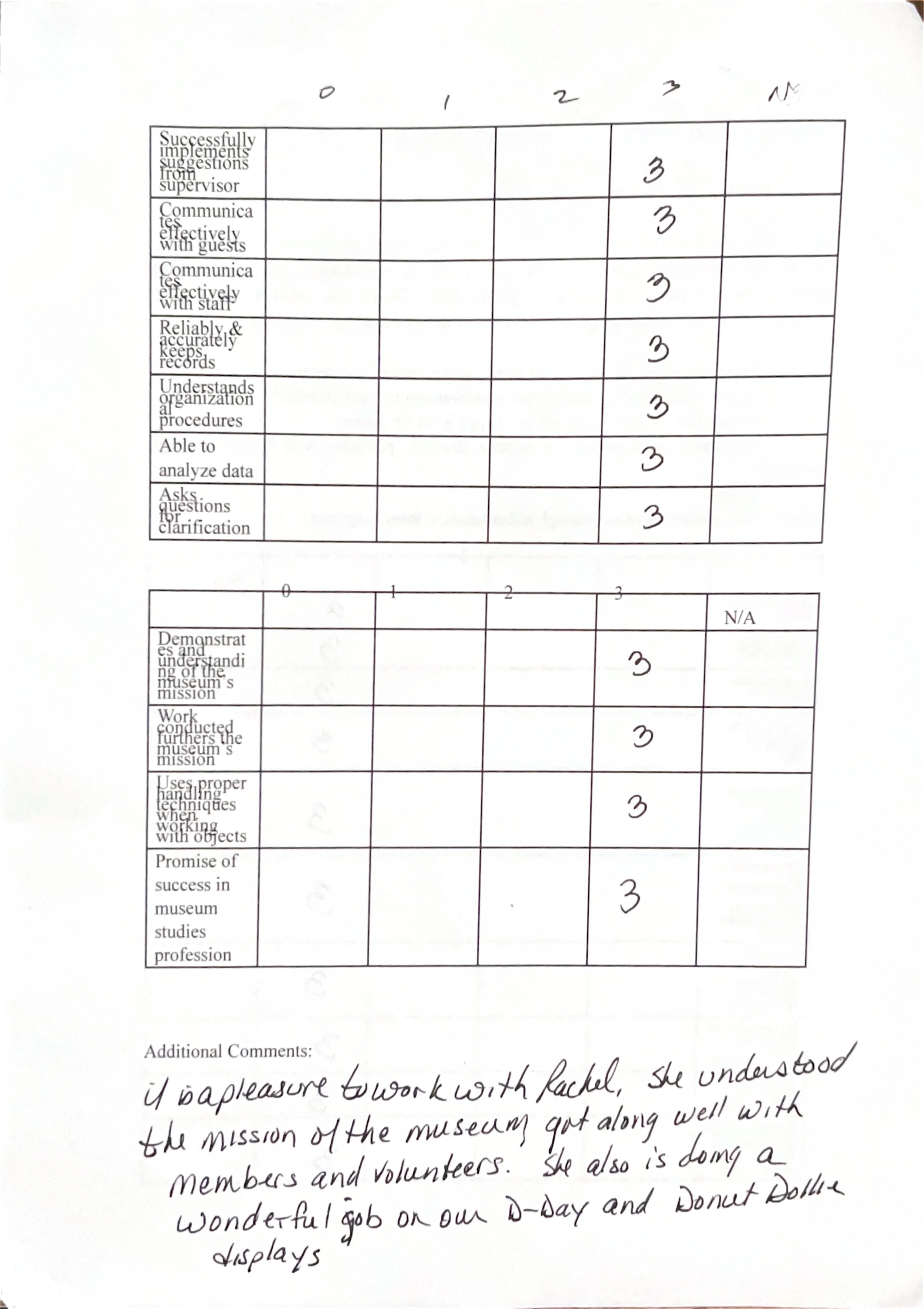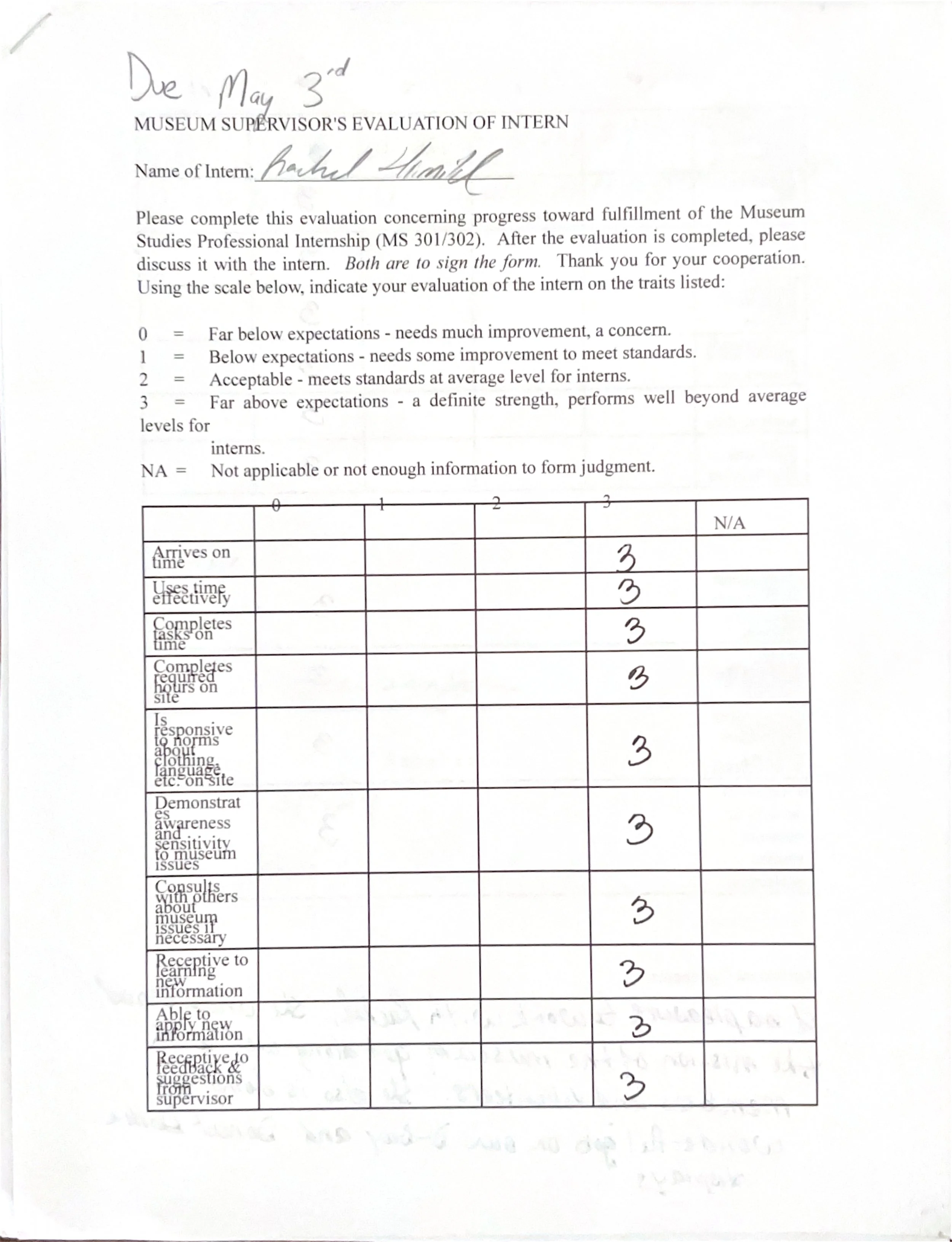 After each internship semester, the internship supervisor, in this case MAPS’ museum director, would complete a final evaluation on my performance. Here are the evaluations from MS 201 Public History Practicum, MS 301 & 302 Museum Studies Internhship I & II, and MS 415 Senior Internship.